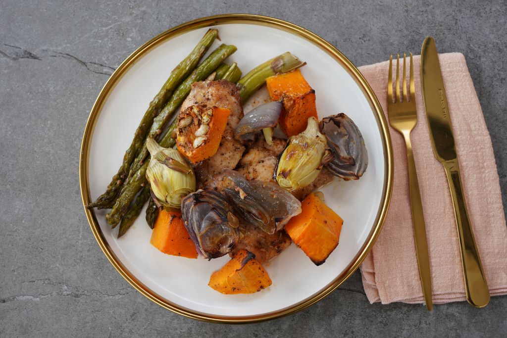 - Coat a large sheet pan with olive oil. Place asparagus on the pan, lightly seasoned with salt. Place the chicken thighs onto the sheet pan. Next, place the artichokes onto the pan. Add the butternut squash chunks. Sliced onions, making sure all ingredients are evenly distributed around the pan so flavors can merge. Add the smashed garlic, thyme and squeeze the juice of the lime on top of all the ingredients on the sheet pan.
