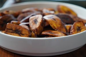 Heat a large cast iron skillet or heavy bottom skillet with enough oil for frying. The oil should reach 350 degrees. Gently place the plantain slices into the oil and fry until golden brown. You can turn them halfway through to cook evenly. Drain on a plate lined with paper towel and enjoy!